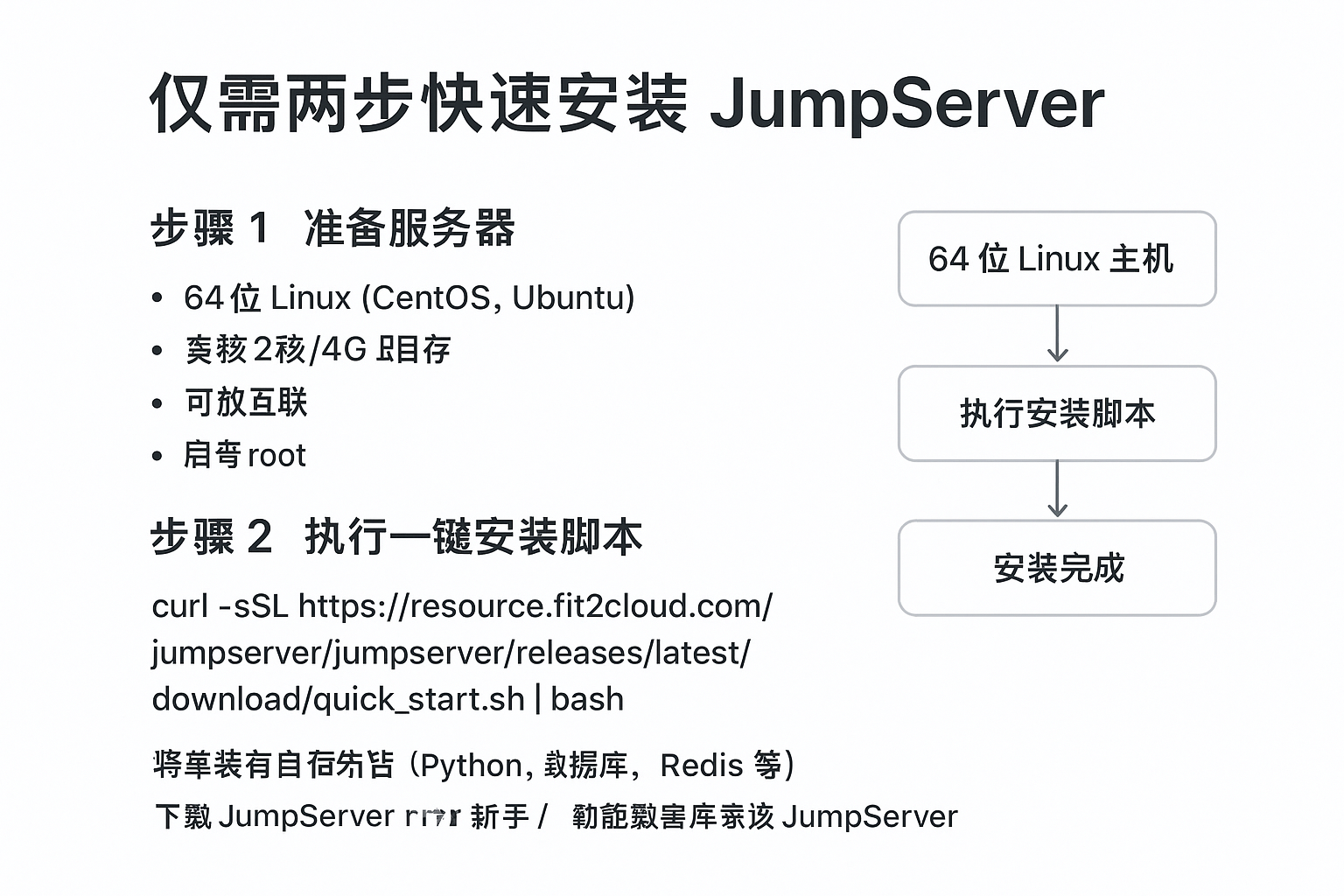 JumpServer 是一款开源堡垒机,支持统一运维管理、审计和安全控制。对于希望快速搭建 JumpServer 的用户,只需两步即可完成安装。